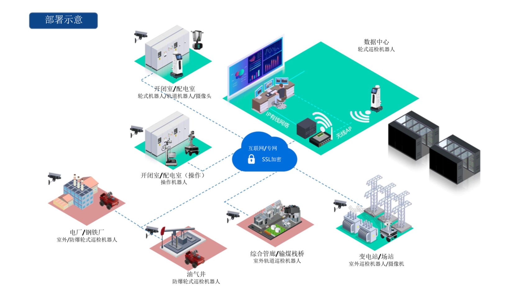 工業智能機器人系統可廣泛應用于電力變電站、冶金化工園區、綜合管廊、數據中心等各種應用場景。